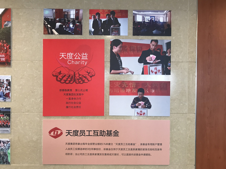 每一分榮譽證書的背后,都離不開為集團(tuán)默默付出的員工。天度集團(tuán)也珍視每一位員工,特別在集團(tuán)內(nèi)部設(shè)立“天度公益”,一個只屬于天度員工的互助基金,賬戶管理由全體員工投票選出三位同事?lián)危?dāng)公司員工及家屬發(fā)生重病或災(zāi)害時,可以直接向該基金申請救助!